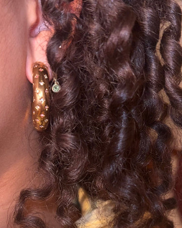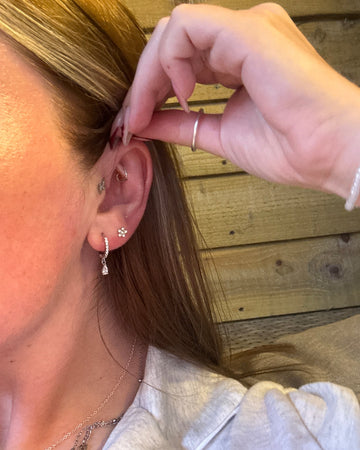One of our best sellers, the Cosima Huggie Earrings are a cosmic-inspired favourite. Each huggie is lined with sparkling stones and finished with a star-shaped drop charm, detailed with a cluster of crystals that shimmer with every movement.
