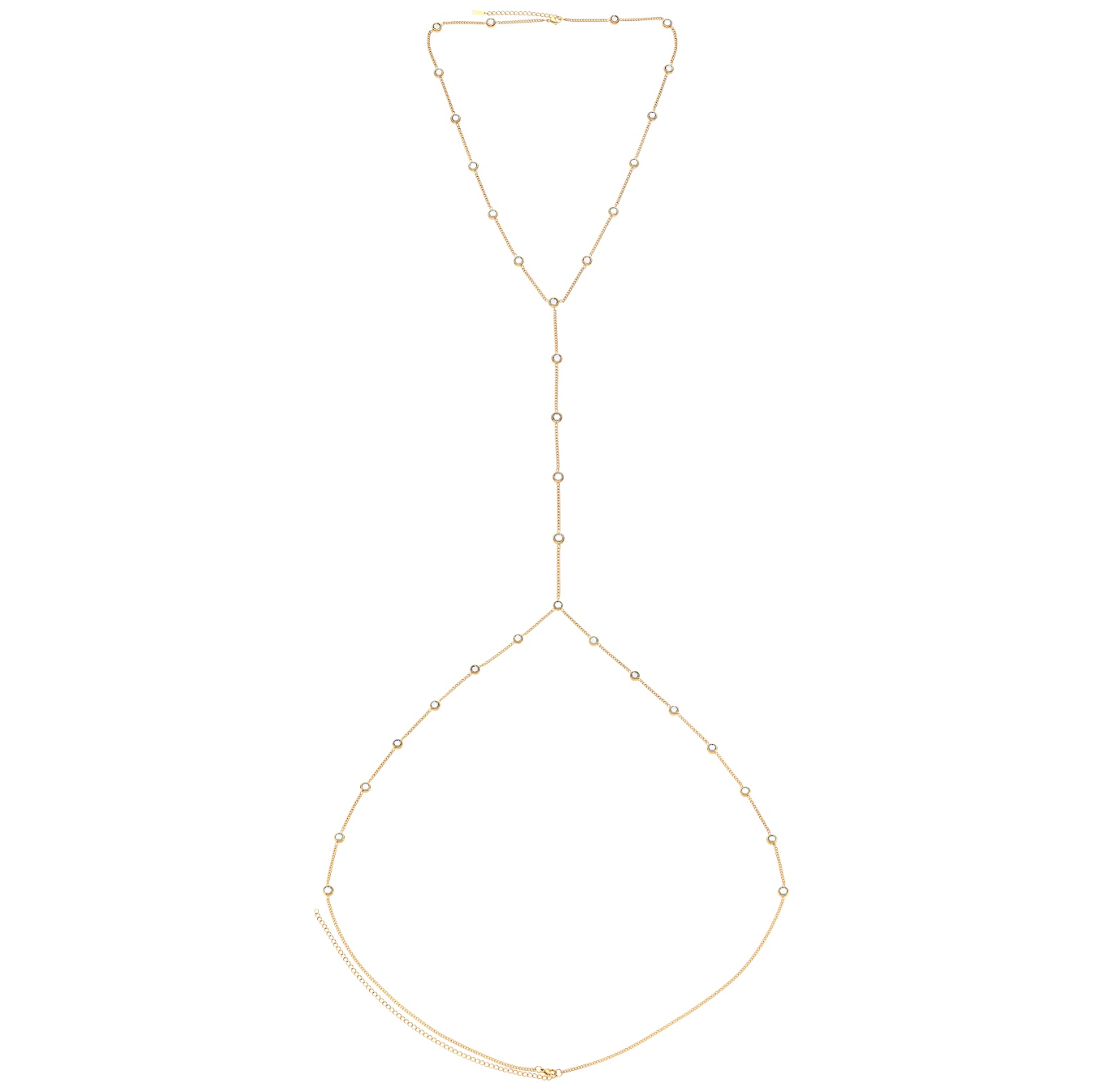 Crafted from stainless steel with an 18k PVD gold finish, it features a fine chain set with evenly spaced bezel set stones from neck to waist. The design flows from a choker-style top into a central drop, connecting to a full waist chain for a flattering, easy fit. Fully adjustable and available in all of our iconic colours.