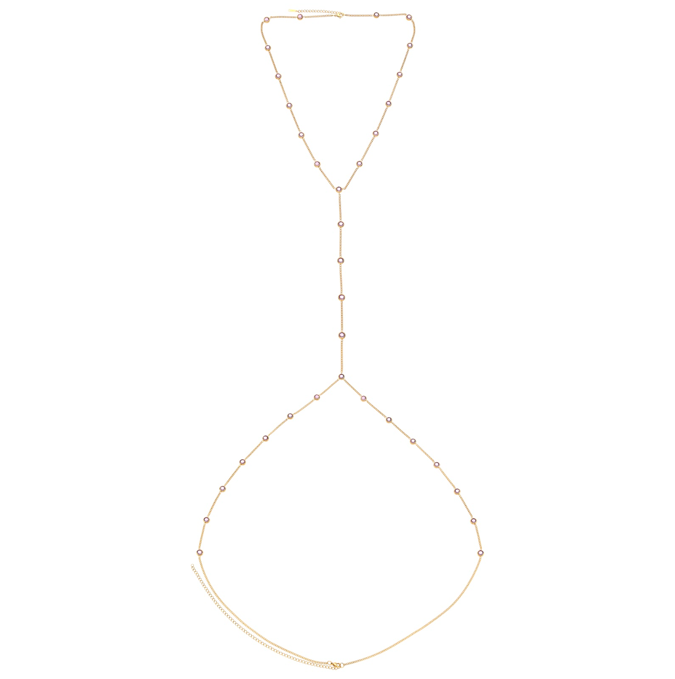 Crafted from stainless steel with an 18k PVD gold finish, it features a fine chain set with evenly spaced bezel set stones from neck to waist. The design flows from a choker-style top into a central drop, connecting to a full waist chain for a flattering, easy fit. Fully adjustable and available in all of our iconic colours.