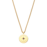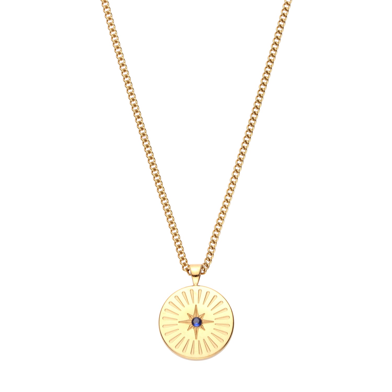 Made from stainless steel with an 18k PVD gold finish, it features a chunky round medallion engraved with fine radial lines and a star detail at the centre. A single stone sits neatly in the middle, available in all of our iconic colours. The pendant hangs from a classic curb chain for a solid, balanced feel.
