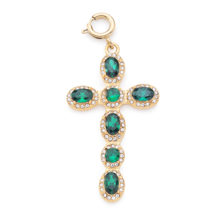 The Phoebe Cross Charm brings a bold pop of colour to any chain. Made from 18k PVD-electroplated water-resistant stainless steel, it’s designed to shine and stay looking new. This charm features a classic cross shape made up of oval and round pink stones, each surrounded by tiny matching crystals for extra sparkle. The gold-tone finish adds warmth, and the hinged clasp makes it easy to clip onto our customer favourite Eleanor Chain Necklace, available in a variety of sizes. Perfect for adding a statement to your everyday layers.