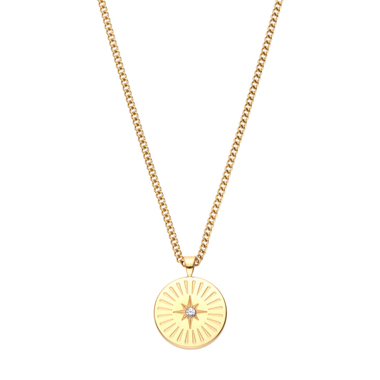 Made from stainless steel with an 18k PVD gold finish, it features a chunky round medallion engraved with fine radial lines and a star detail at the centre. A single stone sits neatly in the middle, available in all of our iconic colours. The pendant hangs from a classic curb chain for a solid, balanced feel.