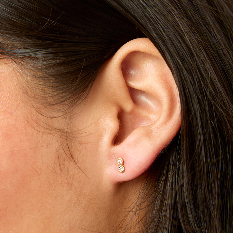 Each stud features two bezel-set stones stacked vertically, creating a clean and modern silhouette that catches the light with every movement. Understated yet eye-catching, these studs are perfect worn alone or layered with other pieces for a polished, versatile look.