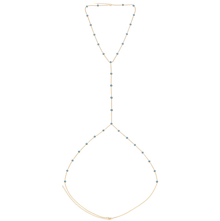 Crafted from stainless steel with an 18k PVD gold finish, it features a fine chain set with evenly spaced bezel set stones from neck to waist. The design flows from a choker-style top into a central drop, connecting to a full waist chain for a flattering, easy fit. Fully adjustable and available in all of our iconic colours.