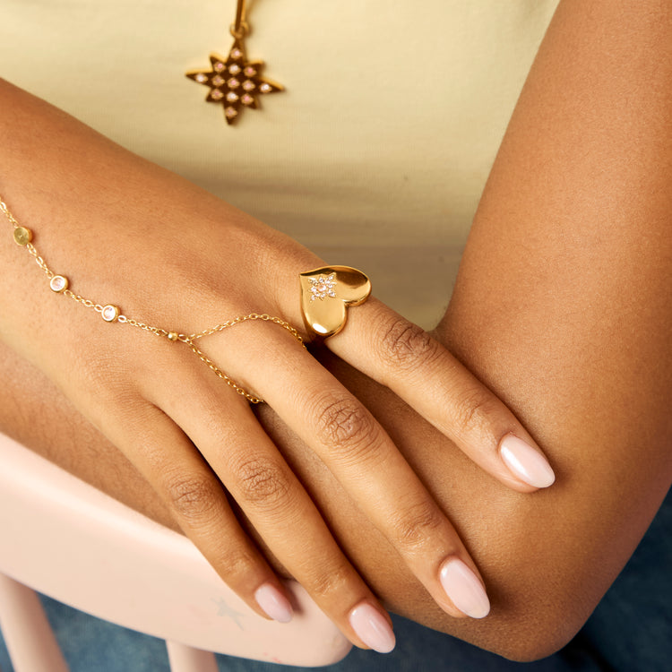 The Ruby Heart Ring is a bold expression of love and style, featuring a sculpted heart design brought to life with a starburst of sparkling stones at its centre. Its smooth, polished finish and radiant detailing make it a standout piece with timeless appeal.