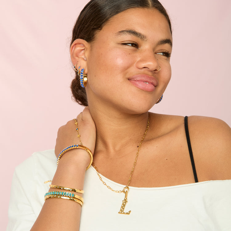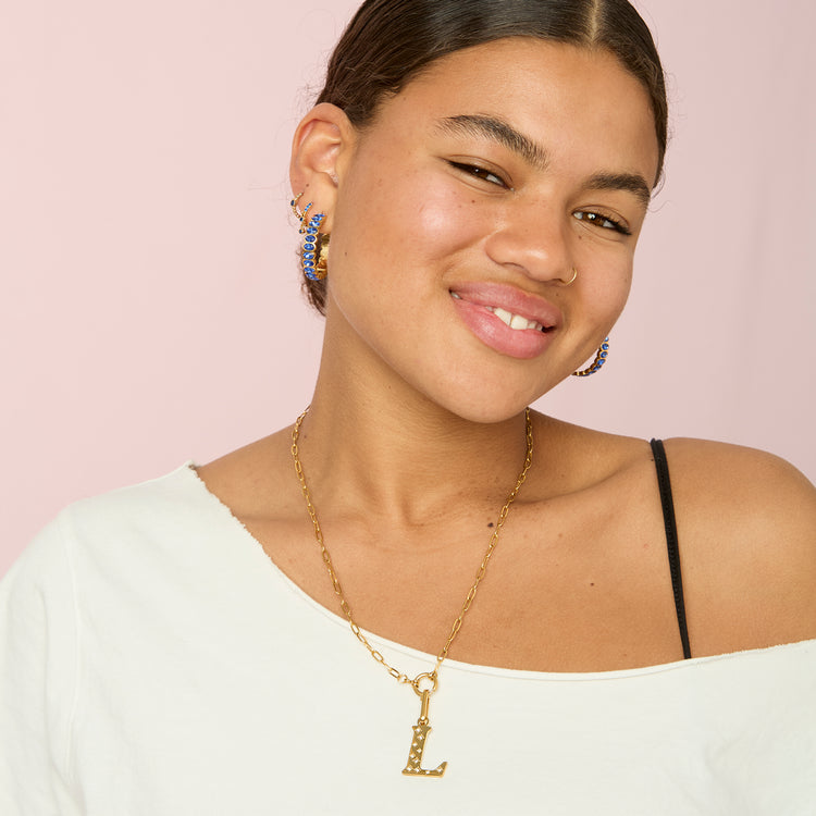 The Minnie Letter Charm adds a touch of sparkle to your everyday style. Made from 18k PVD-electroplated water-resistant stainless steel, each charm features a bold gold-tone letter, please see the letter selection above. The surface is set with tiny star-shaped engravings, each holding a clear stone that catches the light beautifully.