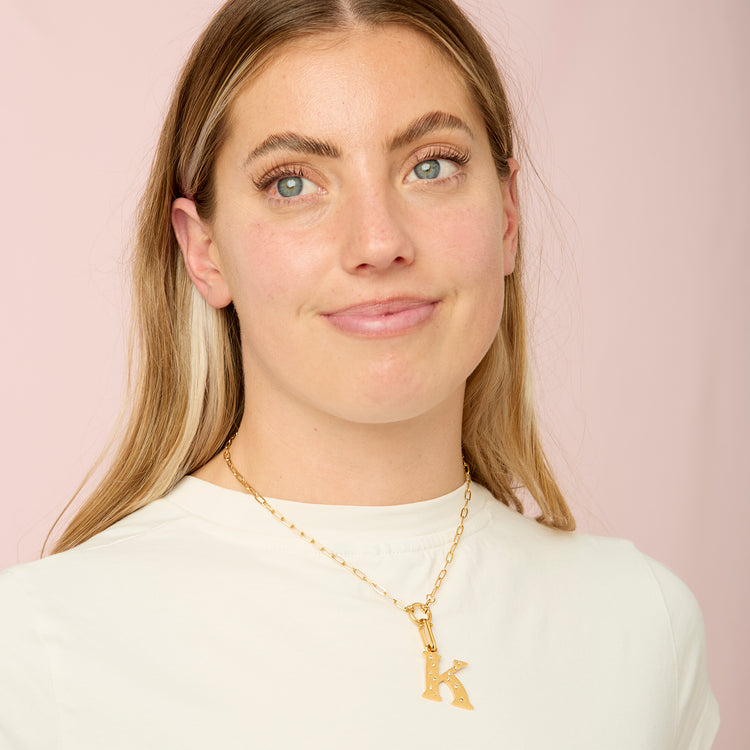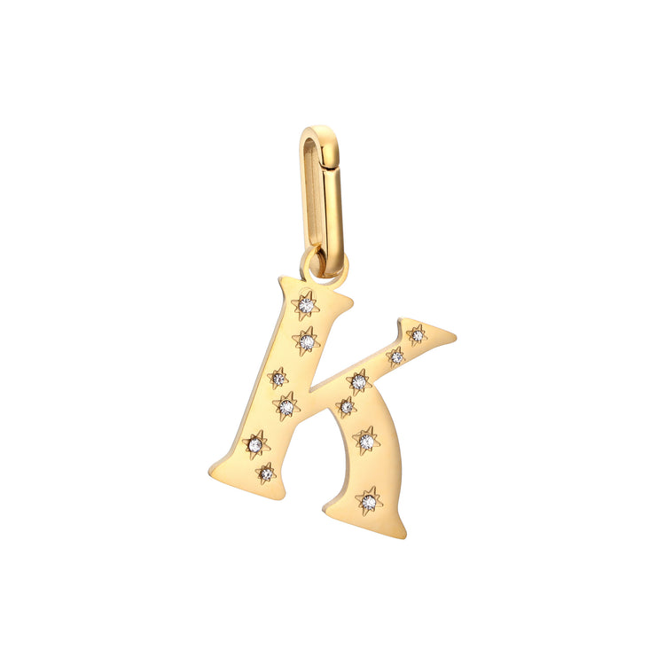 The Minnie Letter Charm adds a touch of sparkle to your everyday style. Made from 18k PVD-electroplated water-resistant stainless steel, each charm features a bold gold-tone letter, please see the letter selection above. The surface is set with tiny star-shaped engravings, each holding a clear stone that catches the light beautifully.