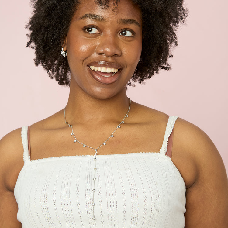 Delicate, elegant, and full of charm, the India Necklace is a refined and relaunched take on our beloved 2024 summer favourite. Featuring a flattering Y-shape silhouette and dainty chain adorned with colourful bezel-set stones, this piece is simple with a statement and the perfect accessory to your outfit.
