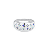 The Isabel Star Ring is a bold yet elegant statement piece designed to stand out. Featuring a smooth domed band scattered with star-shaped settings, each accented by a delicate stone, this ring brings a touch of celestial charm to your everyday style.