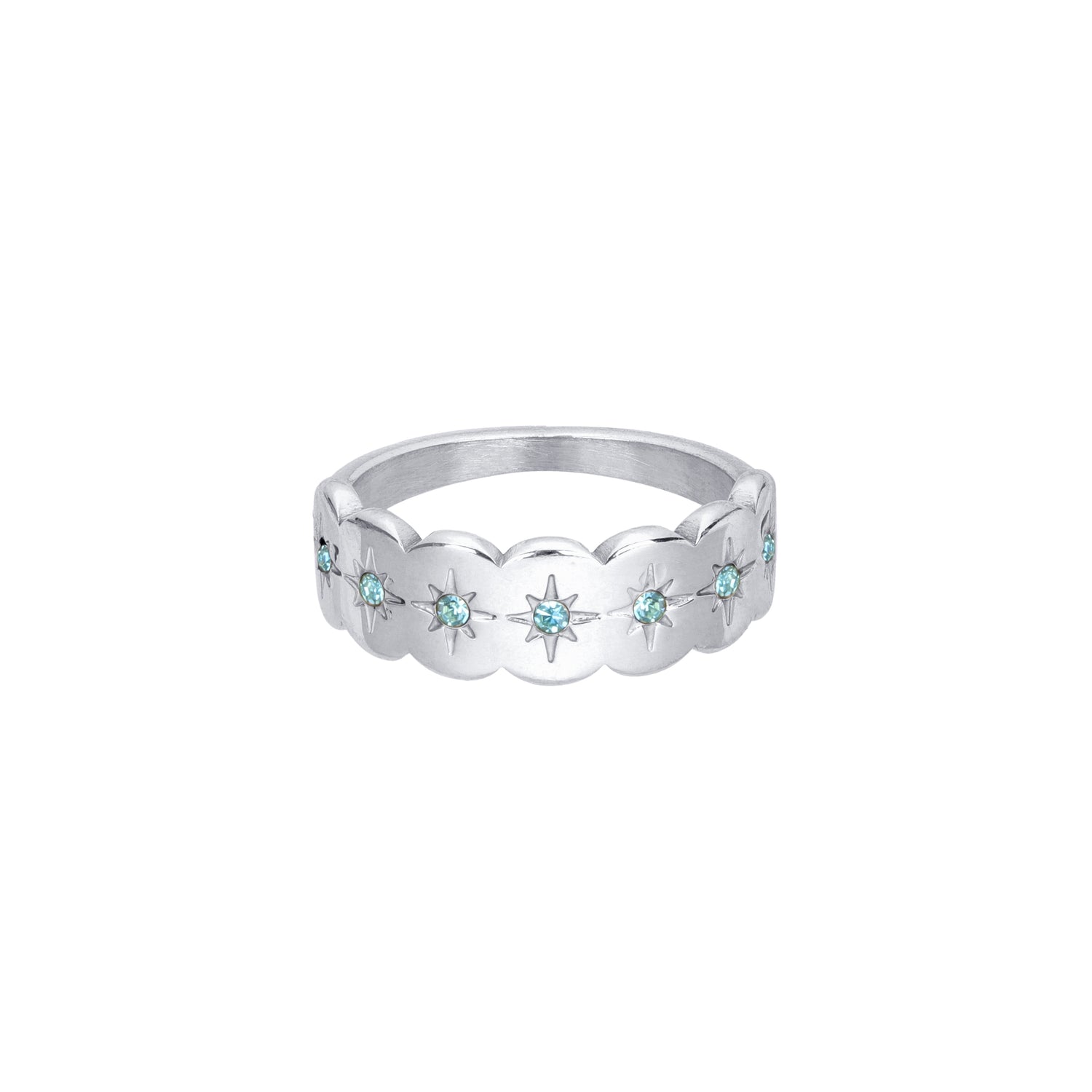 Crafted from stainless steel with a rich 18k PVD gold finish, the band features our classic scalloped edge and a full circle of engraved stars, each set with a single embedded stone in one of our iconic colours. The shape is smooth and comfortable, with just enough detail to make it feel special every day.Available in sizes L (51), N (54) and P (56).