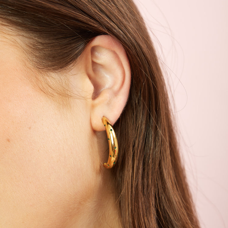 Make an elegant statement with the Skye Chunky Moon Shape Earrings, a bold and sculptural pair inspired by celestial curves. Featuring a smooth, high-shine finish and scattered with delicate star-shaped detailing, each set with a sparkling clear stone, these earrings bring a touch of stardust to your everyday style.