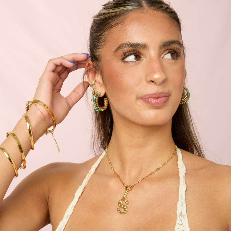 The Minnie Letter Charm adds a touch of sparkle to your everyday style. Made from 18k PVD-electroplated water-resistant stainless steel, each charm features a bold gold-tone letter, please see the letter selection above. The surface is set with tiny star-shaped engravings, each holding a clear stone that catches the light beautifully.
