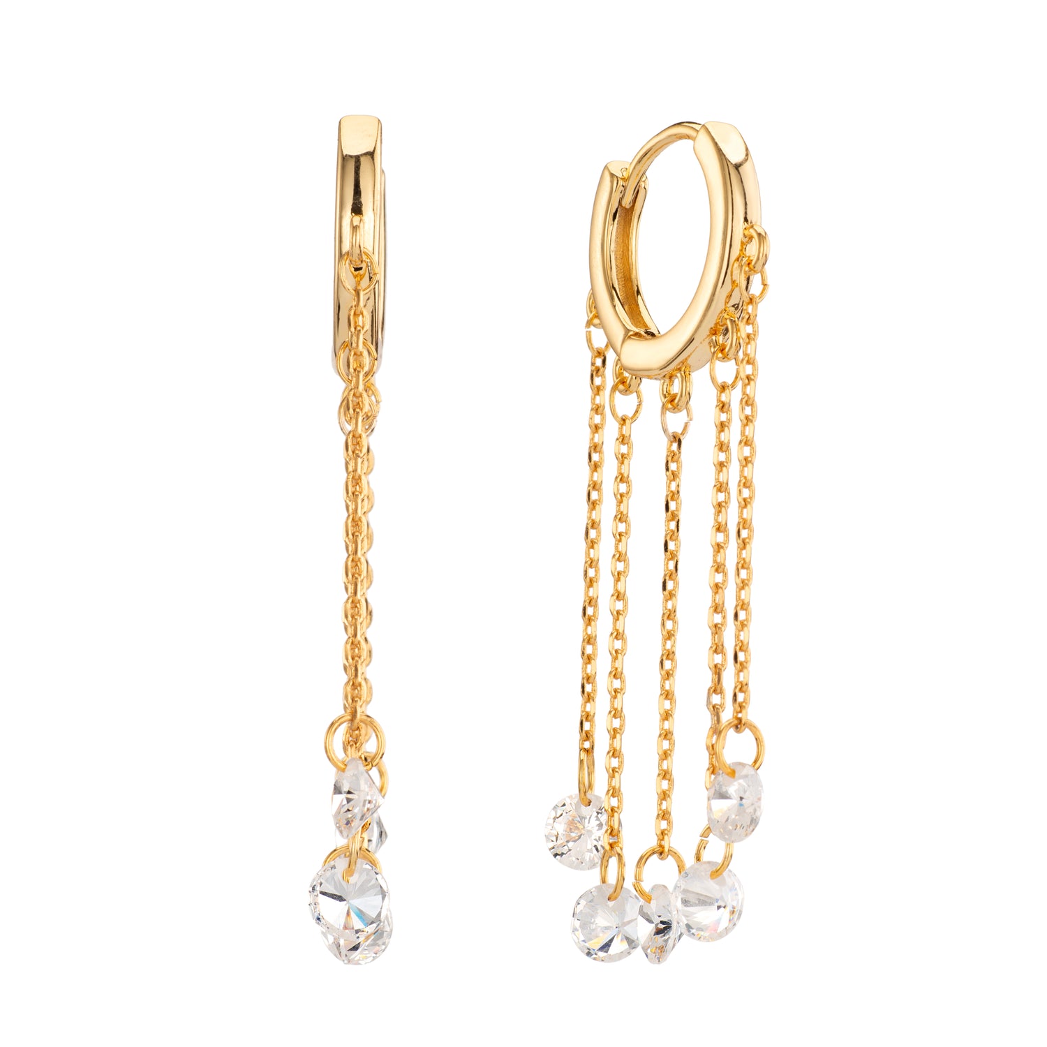 The Alisa Huggie Earrings bring movement and sparkle to your everyday look. Designed with a sleek gold finish, each huggie features delicate dangling chains finished with small crystal drops that catch the light beautifully as you move.