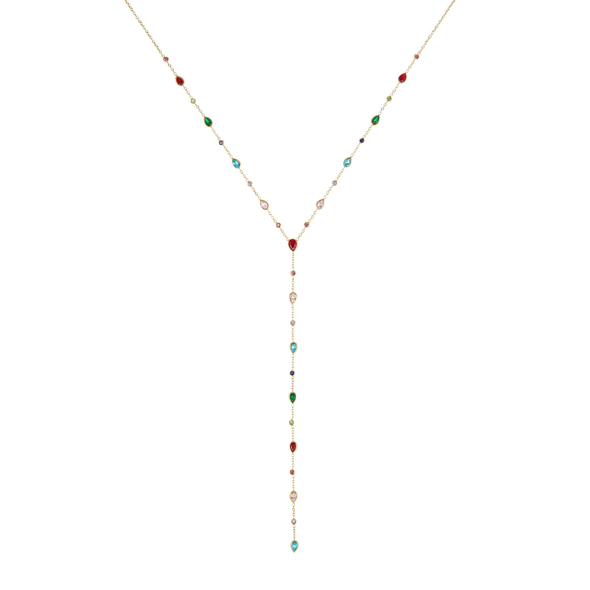 A striking Y-silhouette necklace featuring a delicate chain punctuated by a series of vibrant, multi-shaped stone insets. The design leads to a dramatic drop, creating a fluid, elongated look with a polished metallic finish. Crafted from high-grade stainless steel, it is fully waterproof and tarnish-resistant for enduring daily wear.