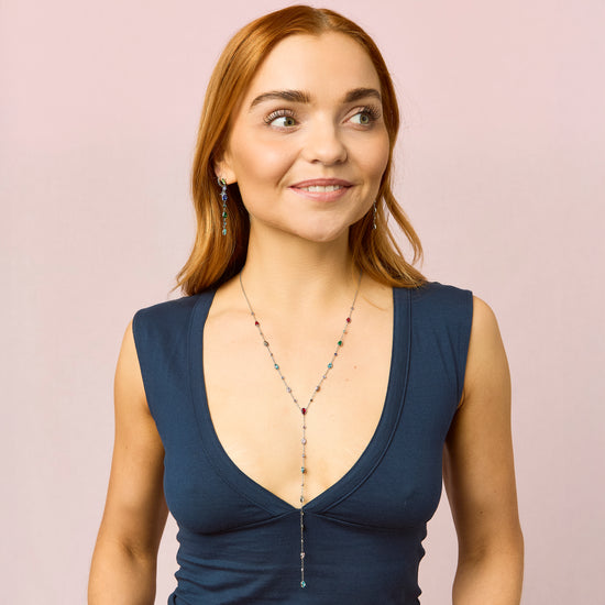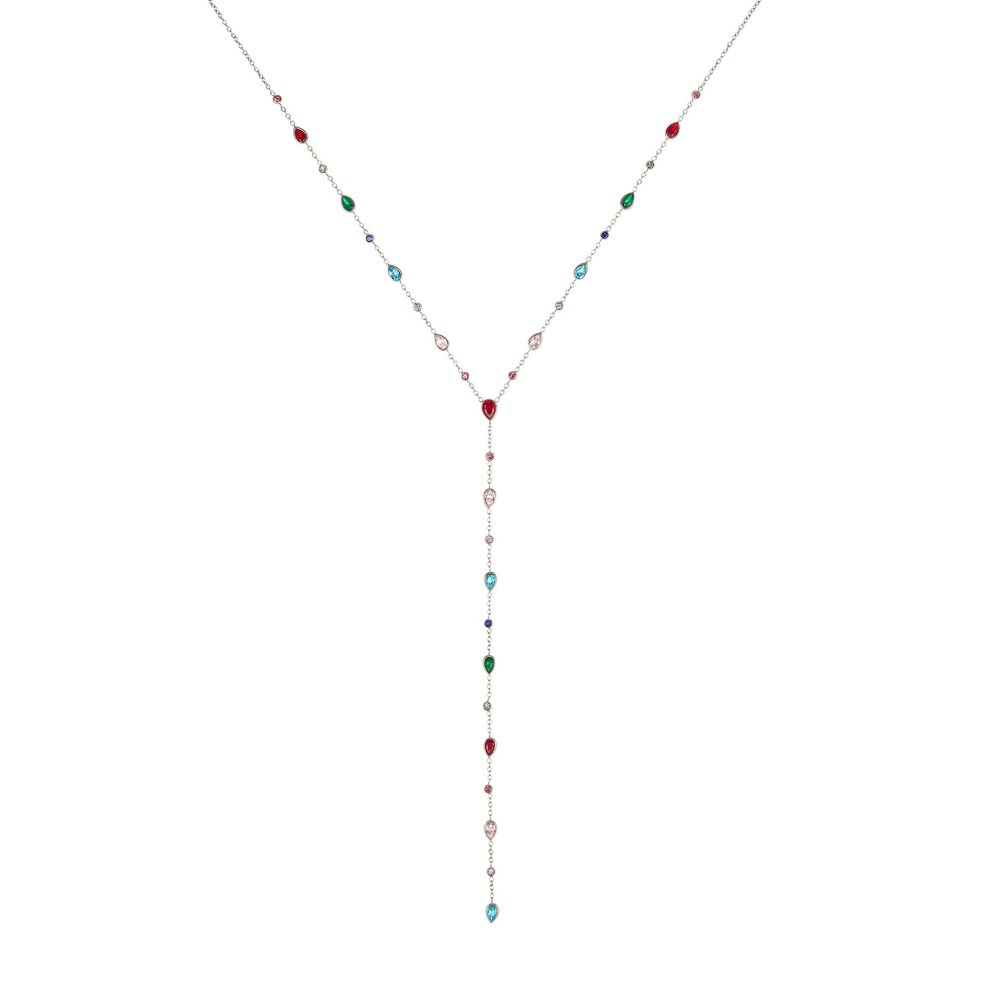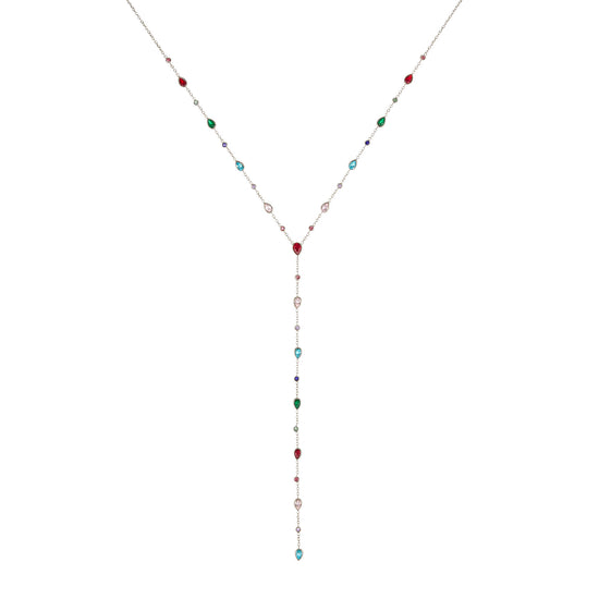 A striking Y-silhouette necklace featuring a delicate chain punctuated by a series of vibrant, multi-shaped stone insets. The design leads to a dramatic drop, creating a fluid, elongated look with a polished metallic finish. Crafted from high-grade stainless steel, it is fully waterproof and tarnish-resistant for enduring daily wear.