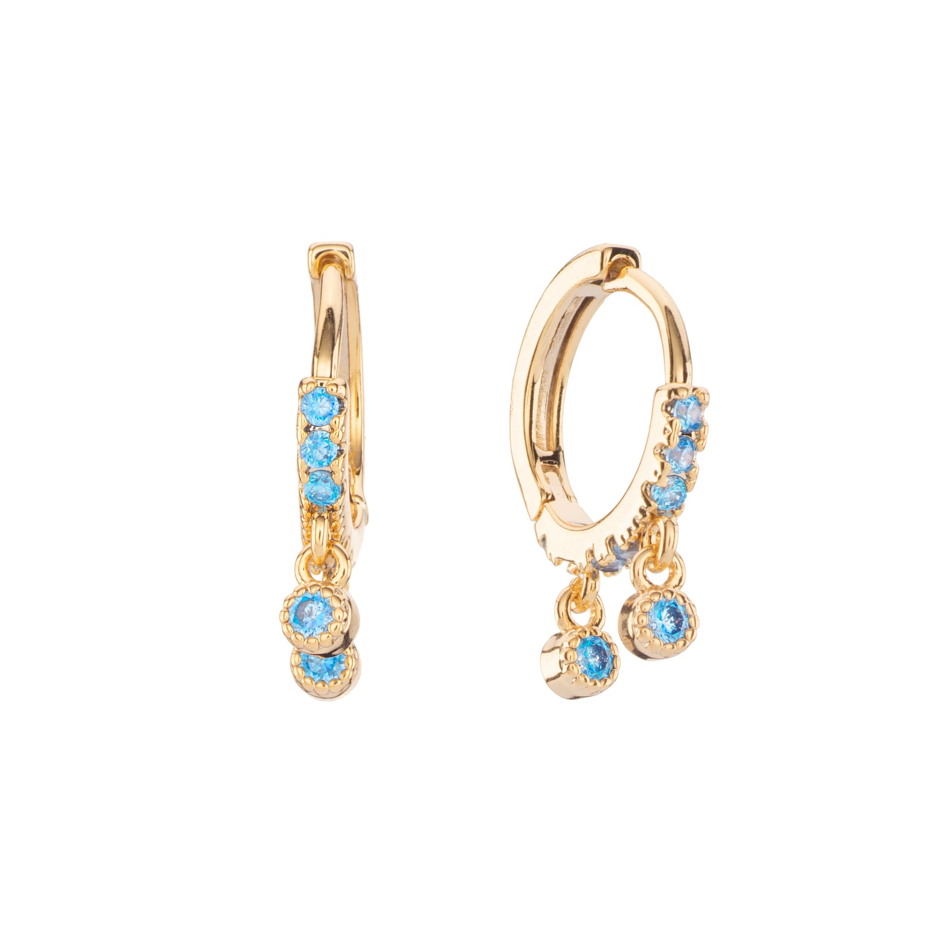 The Camelia Dainty Huggie Earrings are a simple way to add a touch of sparkle to your everyday stack. Designed with a smooth gold finish and set with a row of tiny stones, each huggie features two delicate crystal drops that gently move as you do.