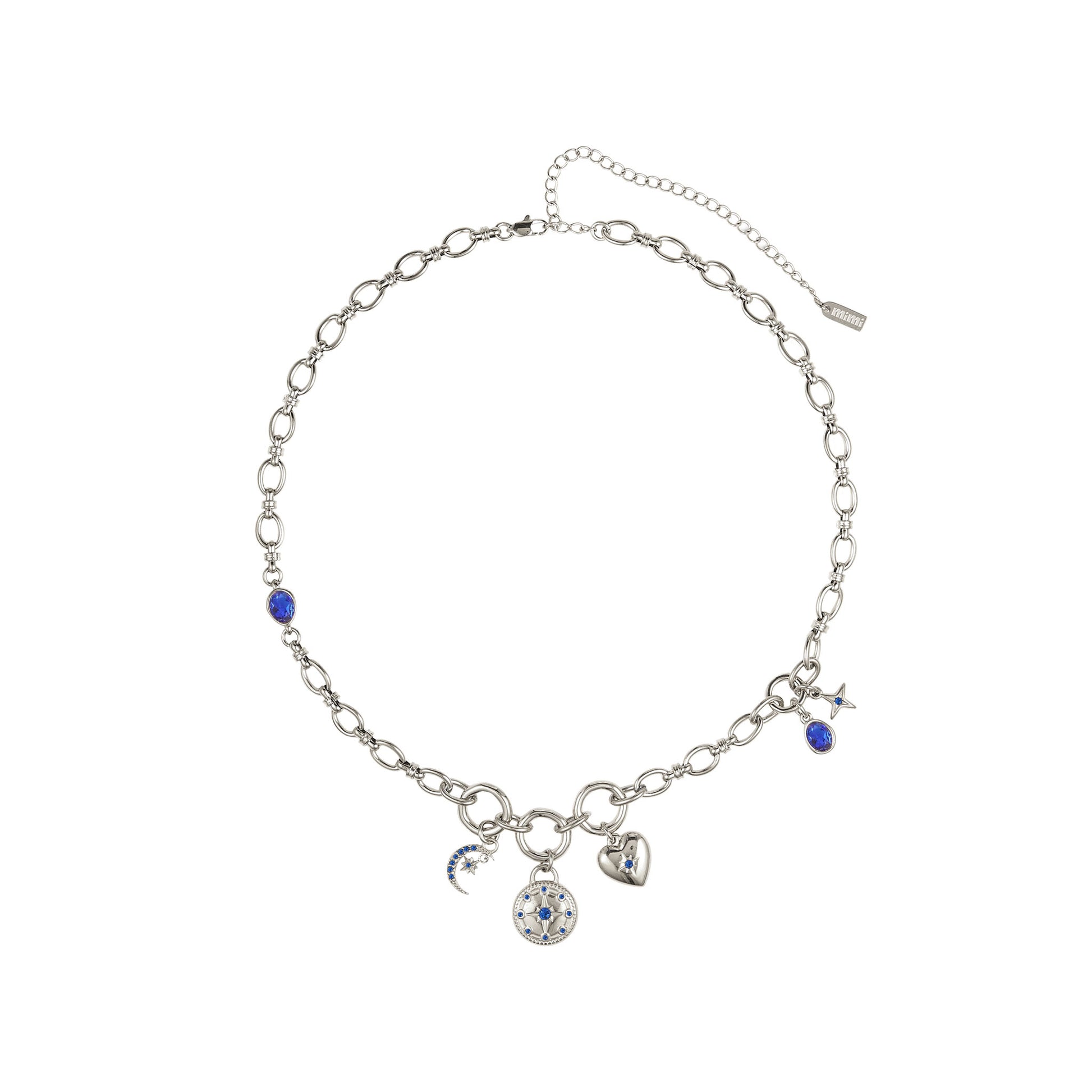 A statement link chain featuring a variety of celestial and heart-shaped charms. This piece is accented with several stone insets and polished metallic elements, designed to sit as a centerpiece in any jewelry pairing. Crafted from high-grade stainless steel, it is fully waterproof and tarnish-resistant for enduring daily wear.