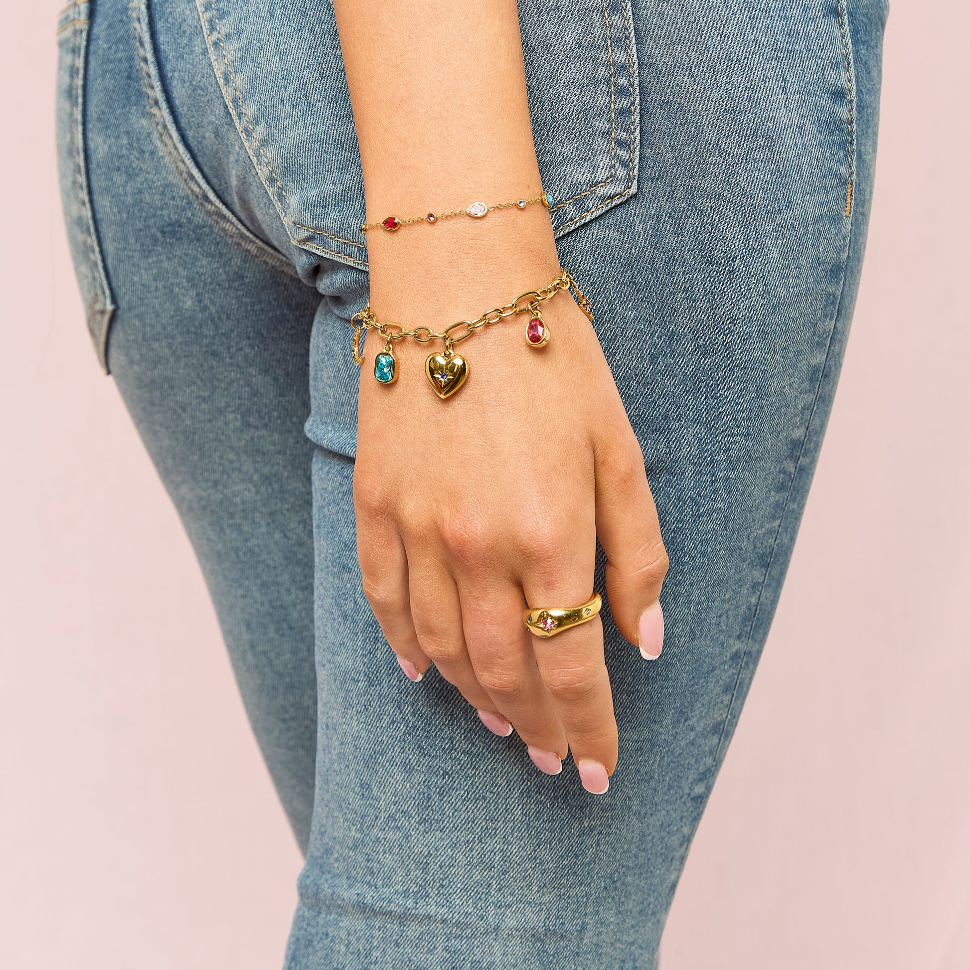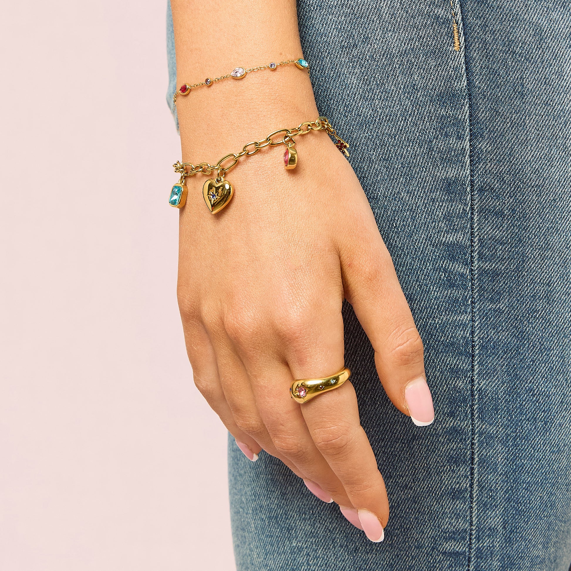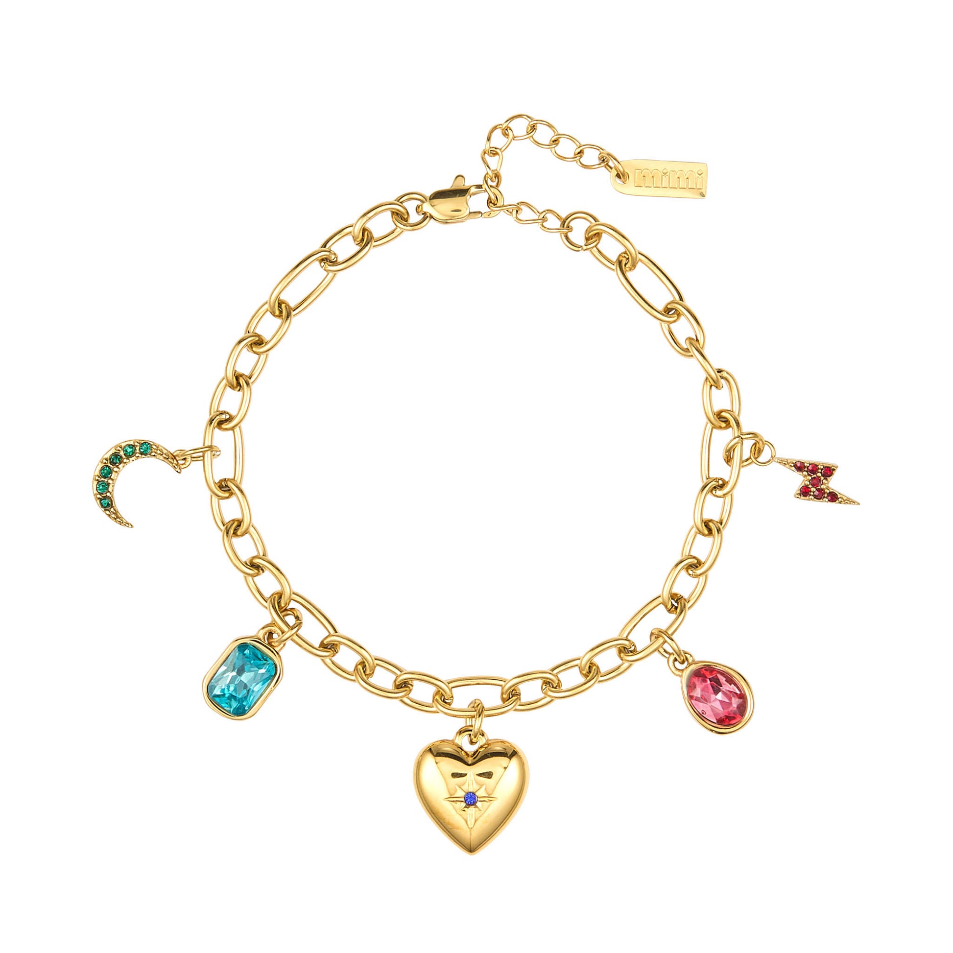 A classic chain link bracelet featuring an eclectic mix of charms, including a central starburst-set heart, a crescent moon, and a lightning bolt. The design is detailed with multiple stone insets in varying shapes that catch the light from every angle. Crafted from high-grade stainless steel, it is fully waterproof and tarnish-resistant for enduring daily wear.
