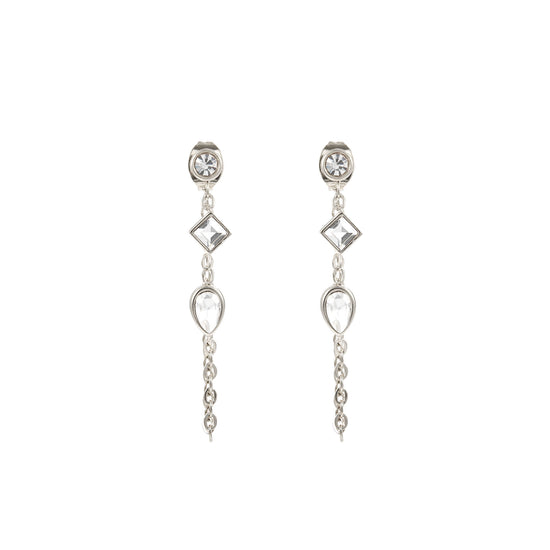 A drop earring design featuring a sequence of vibrant, multi-shaped stone insets suspended from a classic stud. The piece is finished with a delicate chain detail that adds movement and a polished metallic shine. Crafted from high-grade stainless steel, it is fully waterproof and tarnish-resistant for enduring daily wear.