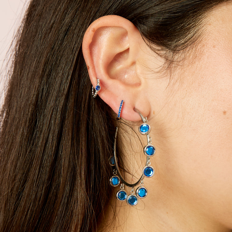 Crafted from stainless steel with an 18k PVD gold finish, the hoops feature a smooth open curve set with bezel framed stones all around the front. Extra stones are suspended as droplets along the bottom for added movement and shine. The mix of fixed and hanging details creates a statement look that catches the light from every angle, they’re the perfect size for dressing up or elevating everyday looks. Available in all of our iconic colours.