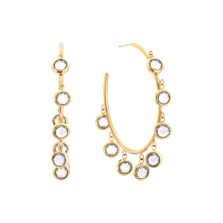 Crafted from stainless steel with an 18k PVD gold finish, the hoops feature a smooth open curve set with bezel framed stones all around the front. Extra stones are suspended as droplets along the bottom for added movement and shine. The mix of fixed and hanging details creates a statement look that catches the light from every angle, they’re the perfect size for dressing up or elevating everyday looks. Available in all of our iconic colours.