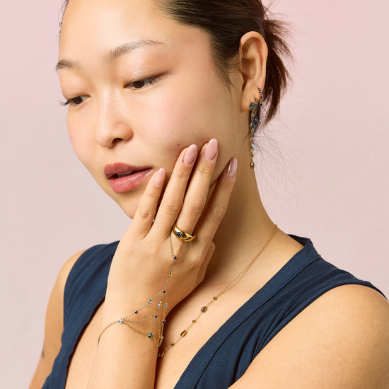 A layered fine-link chain designed to drape elegantly across the hand, connecting a classic bracelet to a single finger loop. This piece is detailed with a series of multi-shaped stone insets that create a delicate, geometric pattern along the chains. Crafted from high-grade stainless steel, it is fully waterproof and tarnish-resistant for enduring daily wear.