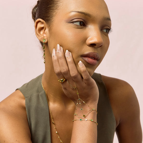 A layered fine-link chain designed to drape elegantly across the hand, connecting a classic bracelet to a single finger loop. This piece is detailed with a series of multi-shaped stone insets that create a delicate, geometric pattern along the chains. Crafted from high-grade stainless steel, it is fully waterproof and tarnish-resistant for enduring daily wear.