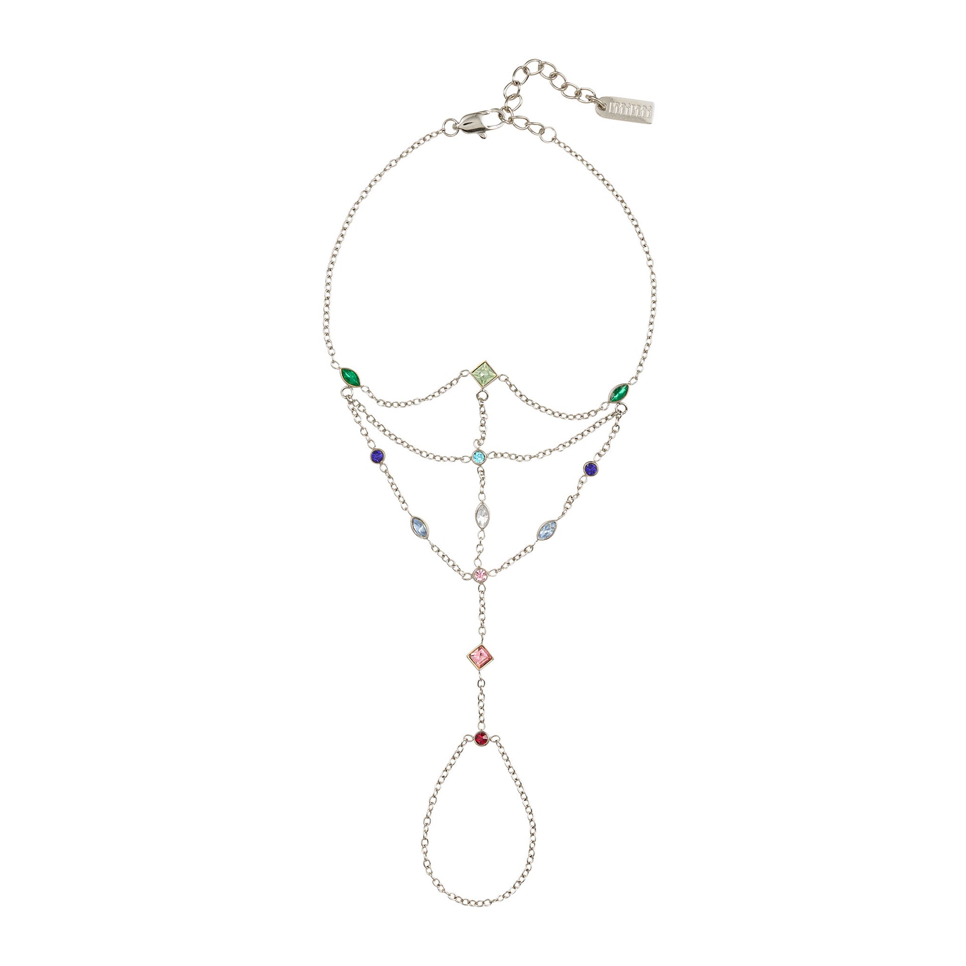 A layered fine-link chain designed to drape elegantly across the hand, connecting a classic bracelet to a single finger loop. This piece is detailed with a series of multi-shaped stone insets that create a delicate, geometric pattern along the chains. Crafted from high-grade stainless steel, it is fully waterproof and tarnish-resistant for enduring daily wear.