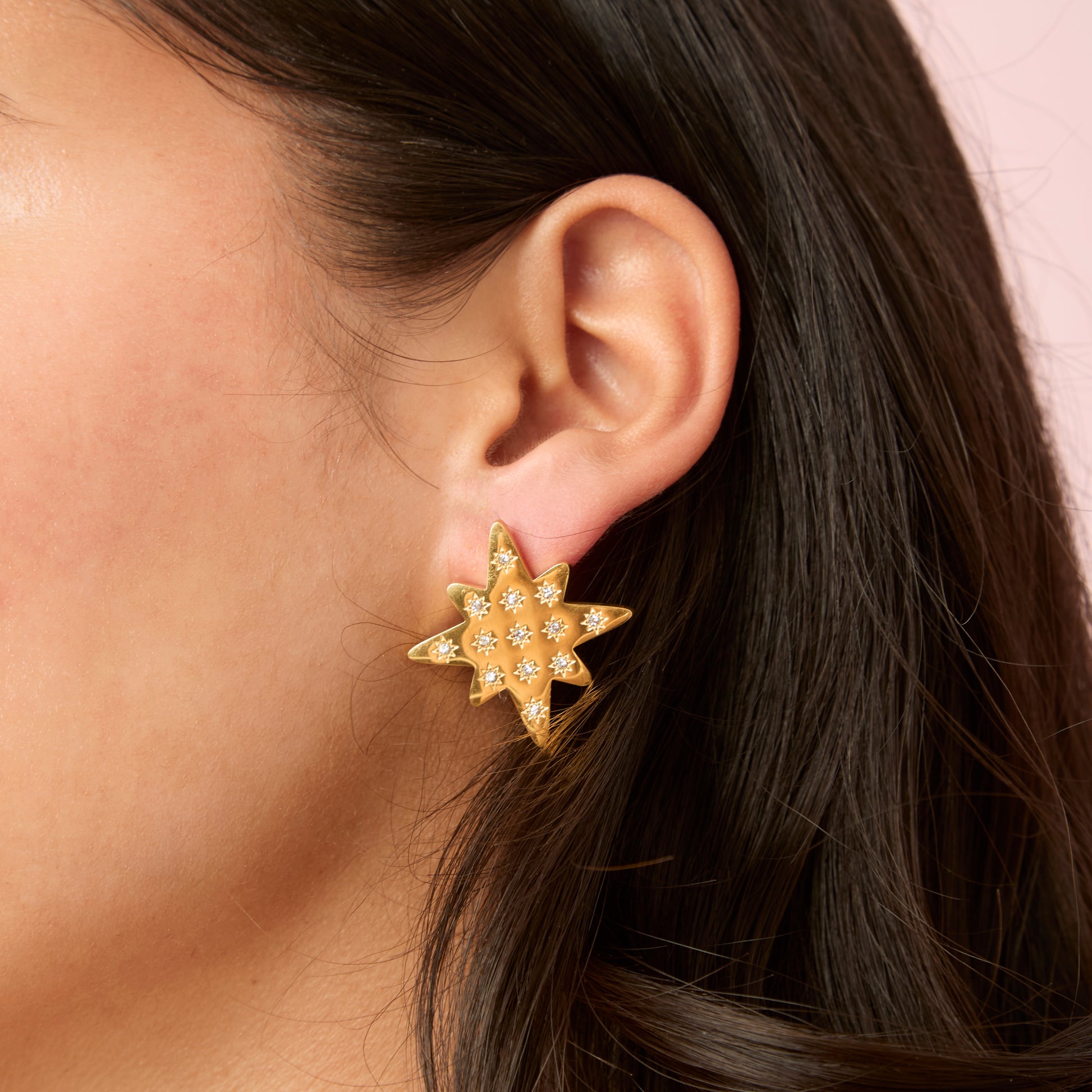Crafted from 18k PVD-electroplated water-resistant stainless steel, they are hypoallergenic and made for lasting wear. Their lightweight yet impactful design makes them perfect for special occasions or adding drama to your everyday look. Style them solo to let them shine or pair with the Willow Ring & Aleena Star Pendant for a coordinated, stargazing-inspired finish.