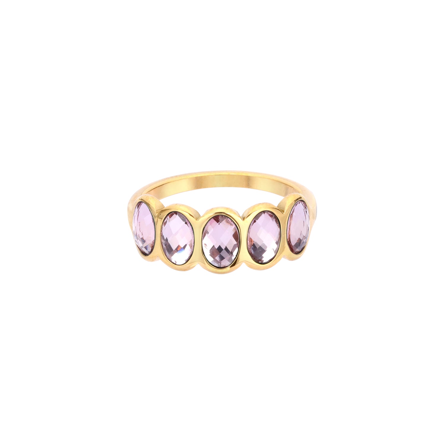 Crafted from stainless steel with an 18k PVD gold finish, it features five oval shaped stones with a faceted surface for extra shine. The stones are bezel set side by side, giving the ring a smooth, rounded shape that catches the light without feeling too heavy. Available in sizes L (51), N (54) and P (56), and in all of our iconic colours.