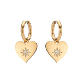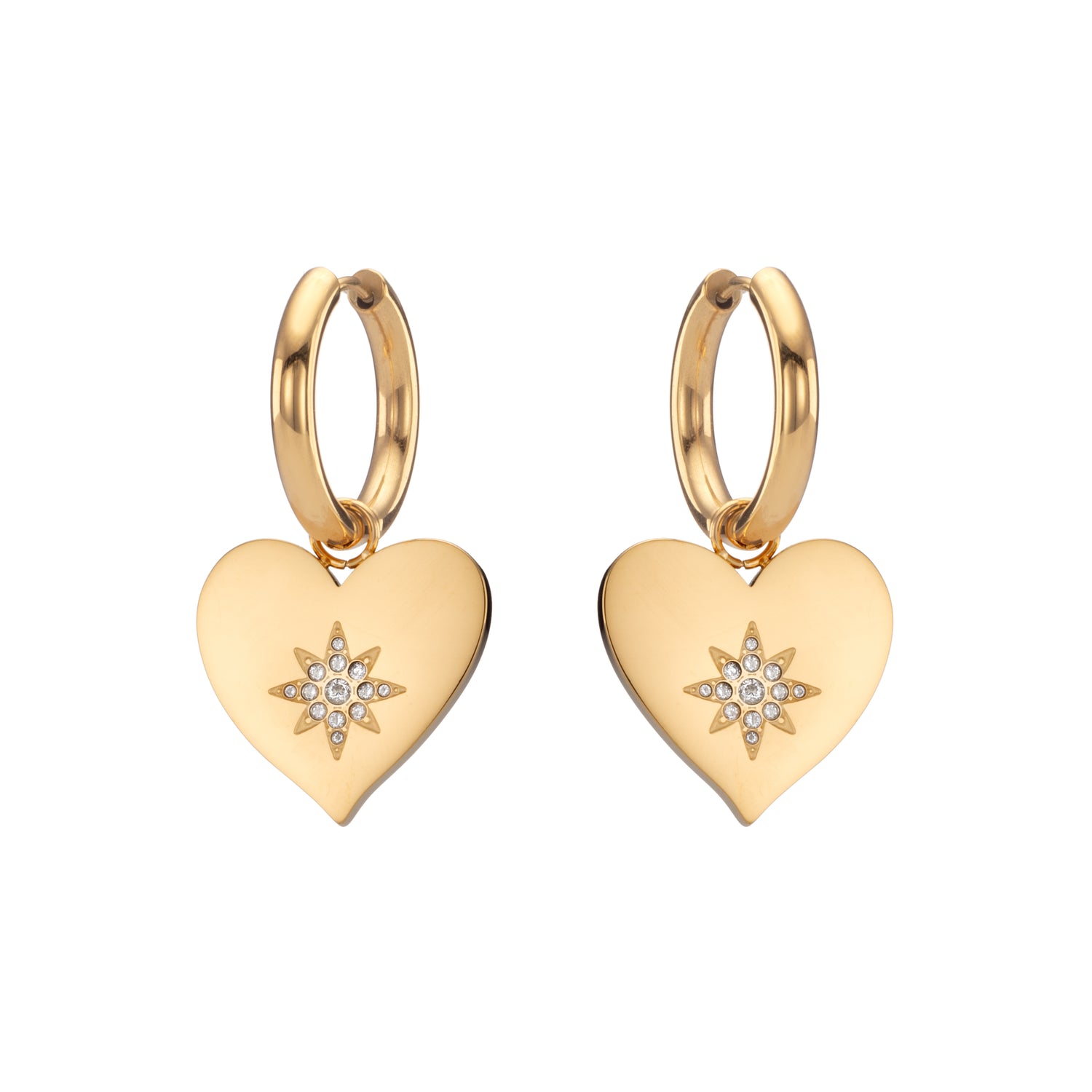 The Lucinda Heart Earrings are the perfect balance of romance and bold style. These statement hoops feature polished heart-shaped charms, each adorned with a starburst of shimmering stones that catch the light beautifully with every movement.