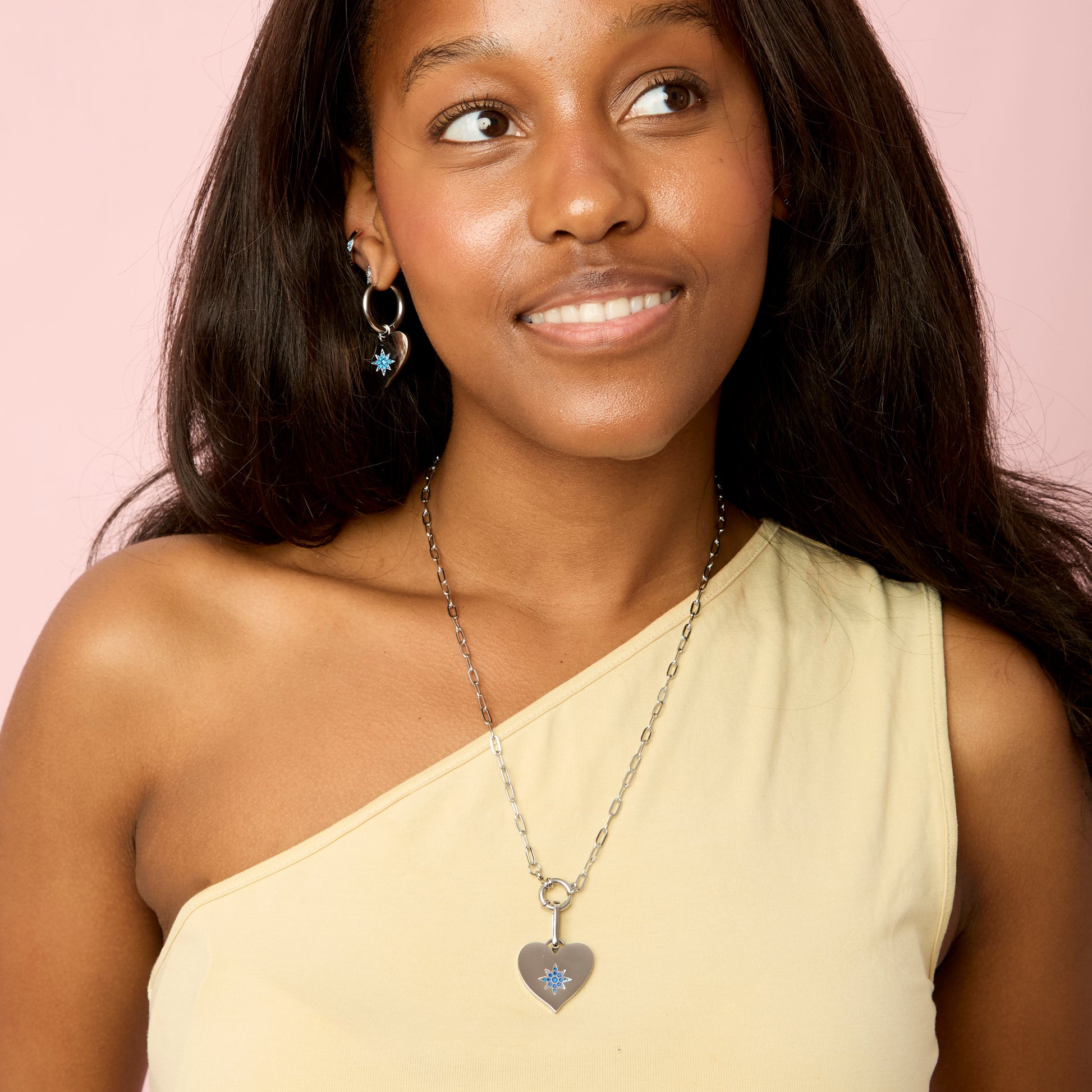 The Millie Heart Pendant Charm is a romantic yet modern piece designed to bring a soft statement to your everyday look. Featuring a smooth heart silhouette embellished with a sparkling starburst centre, it’s a versatile charm full of personality and charm.
