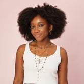 The Phoebe Cross Charm brings a bold pop of colour to any chain. Made from 18k PVD-electroplated water-resistant stainless steel, it’s designed to shine and stay looking new. This charm features a classic cross shape made up of oval and round pink stones, each surrounded by tiny matching crystals for extra sparkle. The gold-tone finish adds warmth, and the hinged clasp makes it easy to clip onto our customer favourite Eleanor Chain Necklace, available in a variety of sizes. Perfect for adding a statement to your everyday layers.