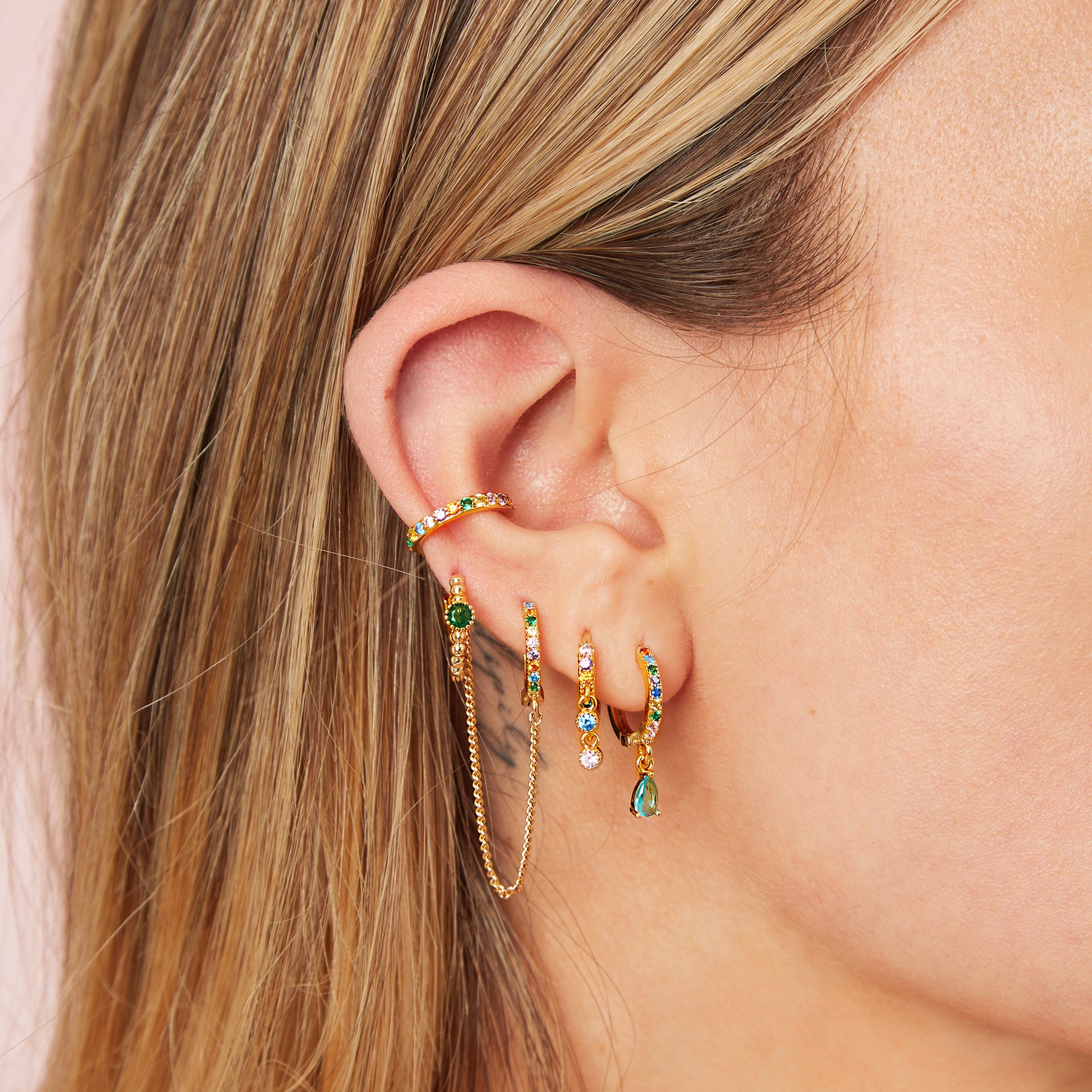Crafted from 14k gold-plated hypoallergenic copper, each piece is lightweight, comfortable and easy to style. The set includes a mix of bold textures, crystal drops and a standout huggie and cuff chain combo. The chain connects a classic huggie, which goes through a piercing, to a matching cuff that sits securely on the ear with no piercing needed.