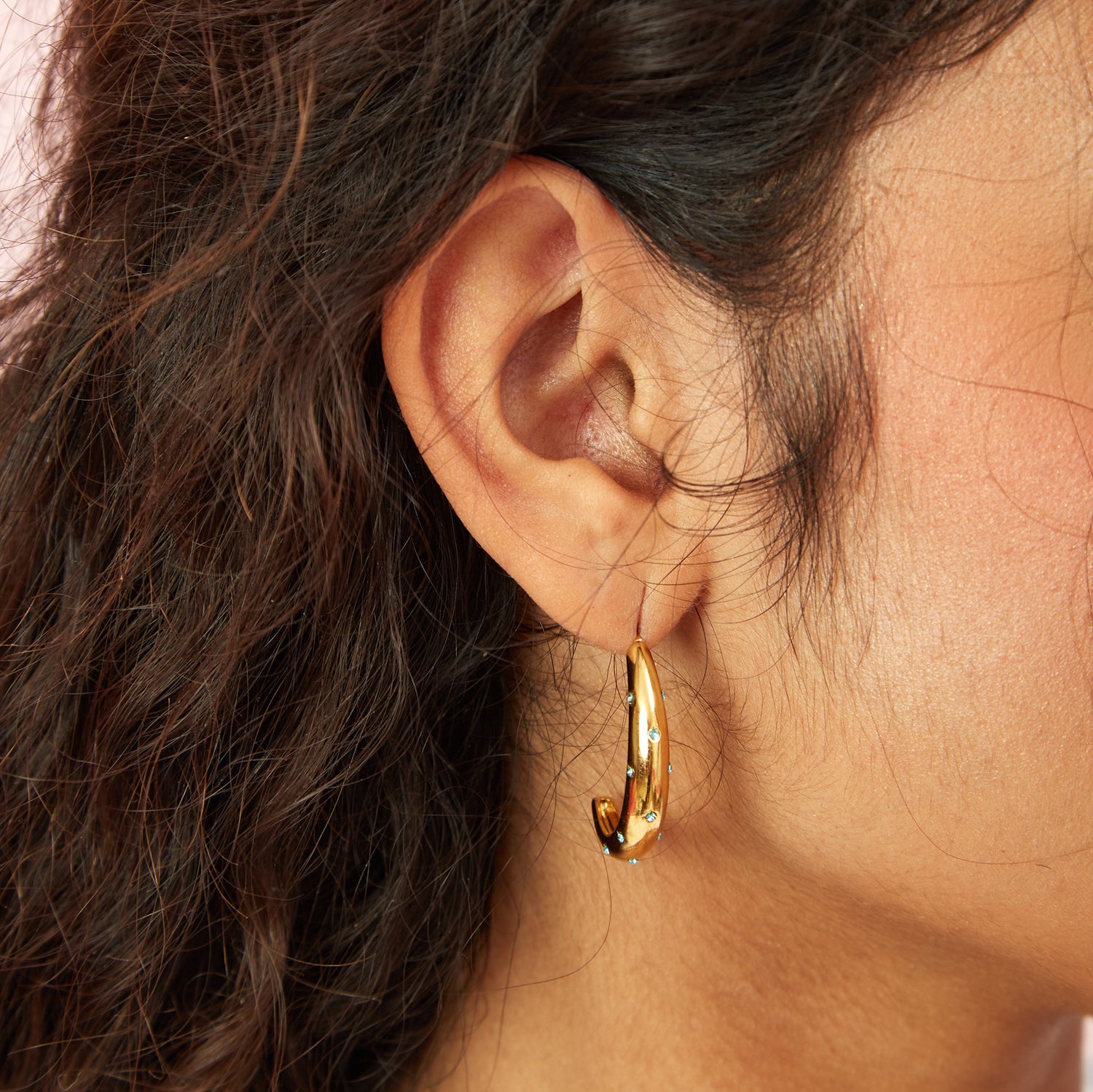 Crafted from 18k PVD-electroplated water-resistant stainless steel, they are hypoallergenic and built for lasting wear. The chunky crescent silhouette adds a modern edge with a dreamy twist.