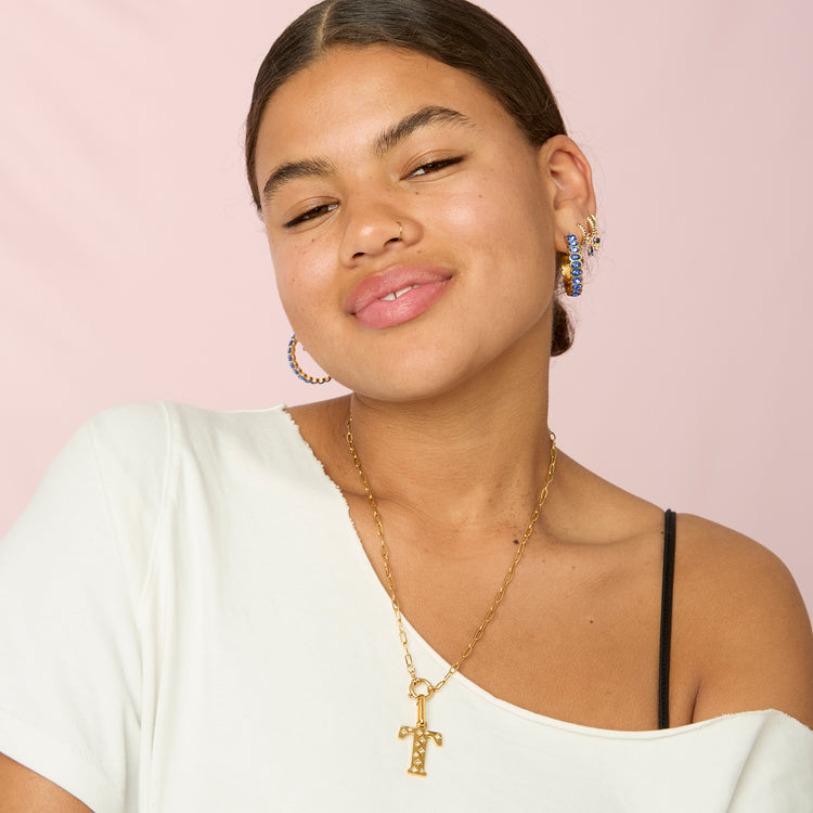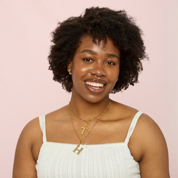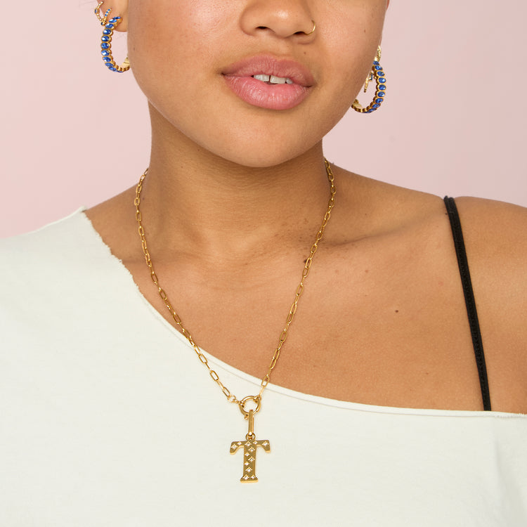 The Minnie Letter Charm adds a touch of sparkle to your everyday style. Made from 18k PVD-electroplated water-resistant stainless steel, each charm features a bold gold-tone letter, please see the letter selection above. The surface is set with tiny star-shaped engravings, each holding a clear stone that catches the light beautifully.