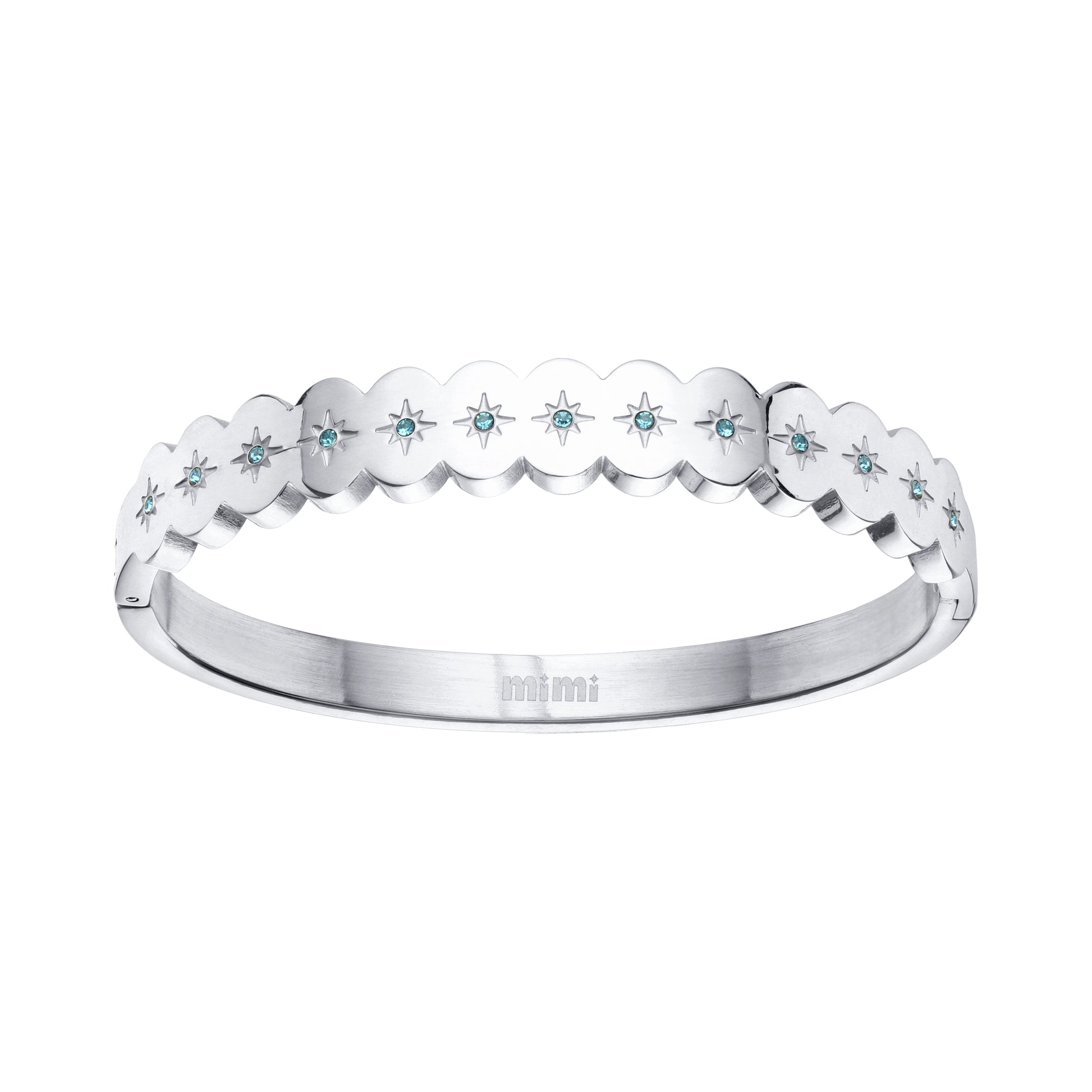 Made from stainless steel with a glossy 18k PVD gold finish, it features our signature scalloped edge and a row of engraved stars, each set with an embedded stone in one of our iconic colours. The smooth polished interior is engraved with the mimi logo and fastens with a discreet clasp for a seamless fit. It’s perfect for stacking or wearing solo when you want just the right touch of shine. Pair this with the Tallulah Scallop Star Ring for the perfect gift!