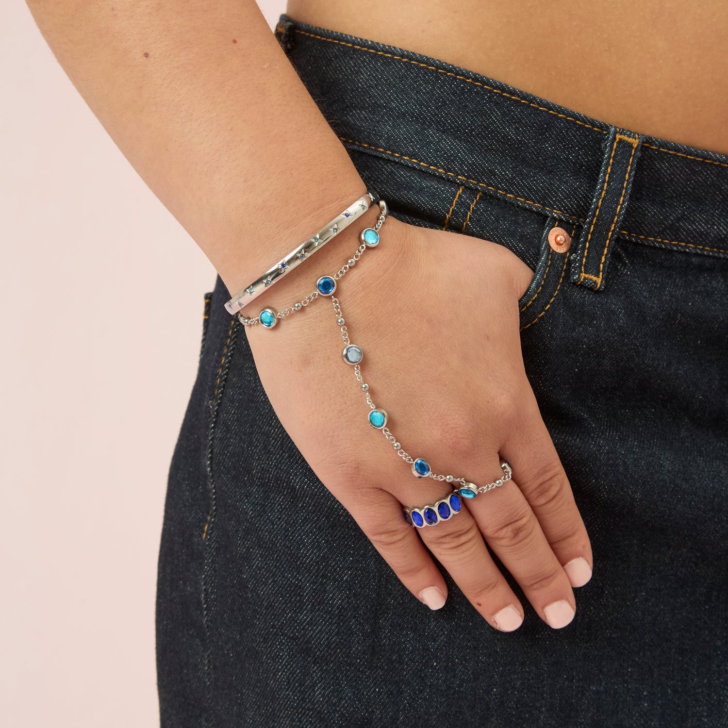 Made from stainless steel with an 18k PVD gold coating, it features a full chain bracelet connected to a central chain that loops around the finger. The design is dotted with bezel set stones from wrist to finger, offering subtle sparkle and movement. The style curves neatly around the hand and secures with a clasp and extender. Available in all our iconic ombre colours.