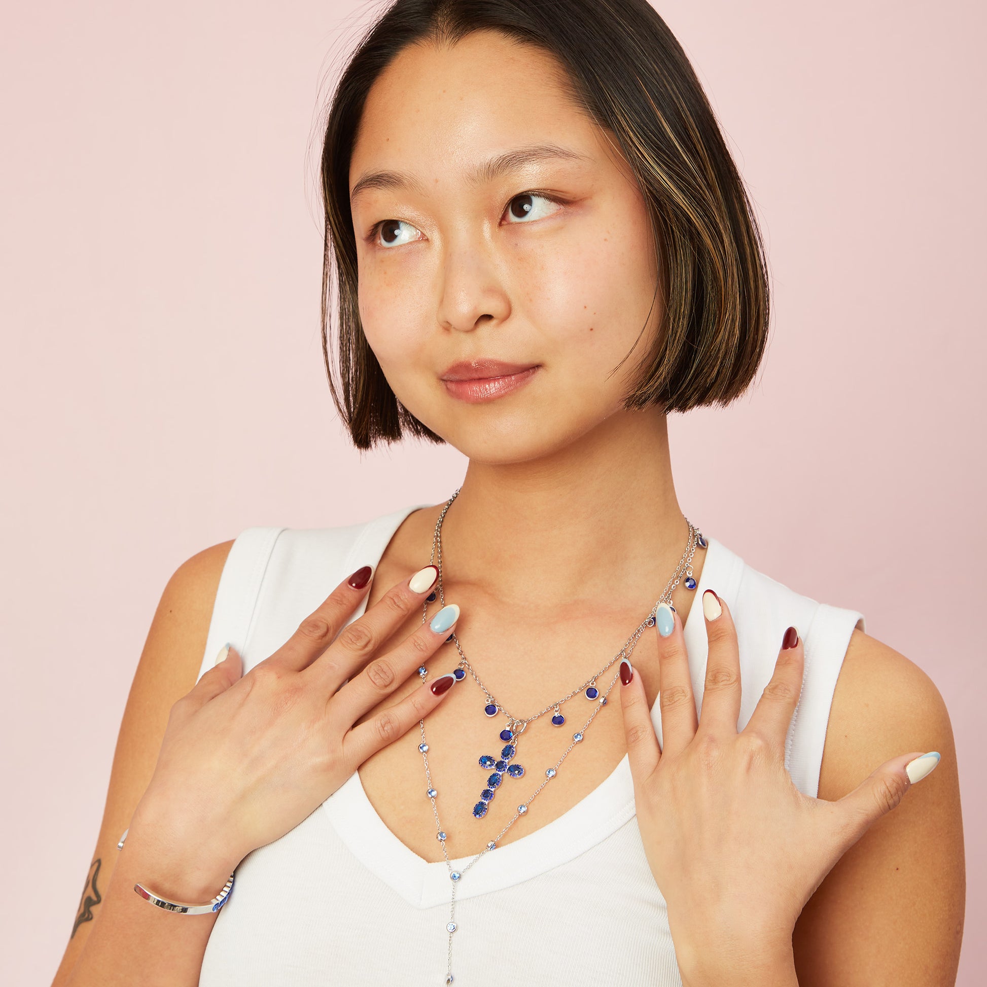 The Phoebe Cross Charm brings a bold pop of colour to any chain. Made from 18k PVD-electroplated water-resistant stainless steel, it’s designed to shine and stay looking new. This charm features a classic cross shape made up of oval and round pink stones, each surrounded by tiny matching crystals for extra sparkle. The gold-tone finish adds warmth, and the hinged clasp makes it easy to clip onto our customer favourite Eleanor Chain Necklace, available in a variety of sizes. Perfect for adding a statement to your everyday layers.